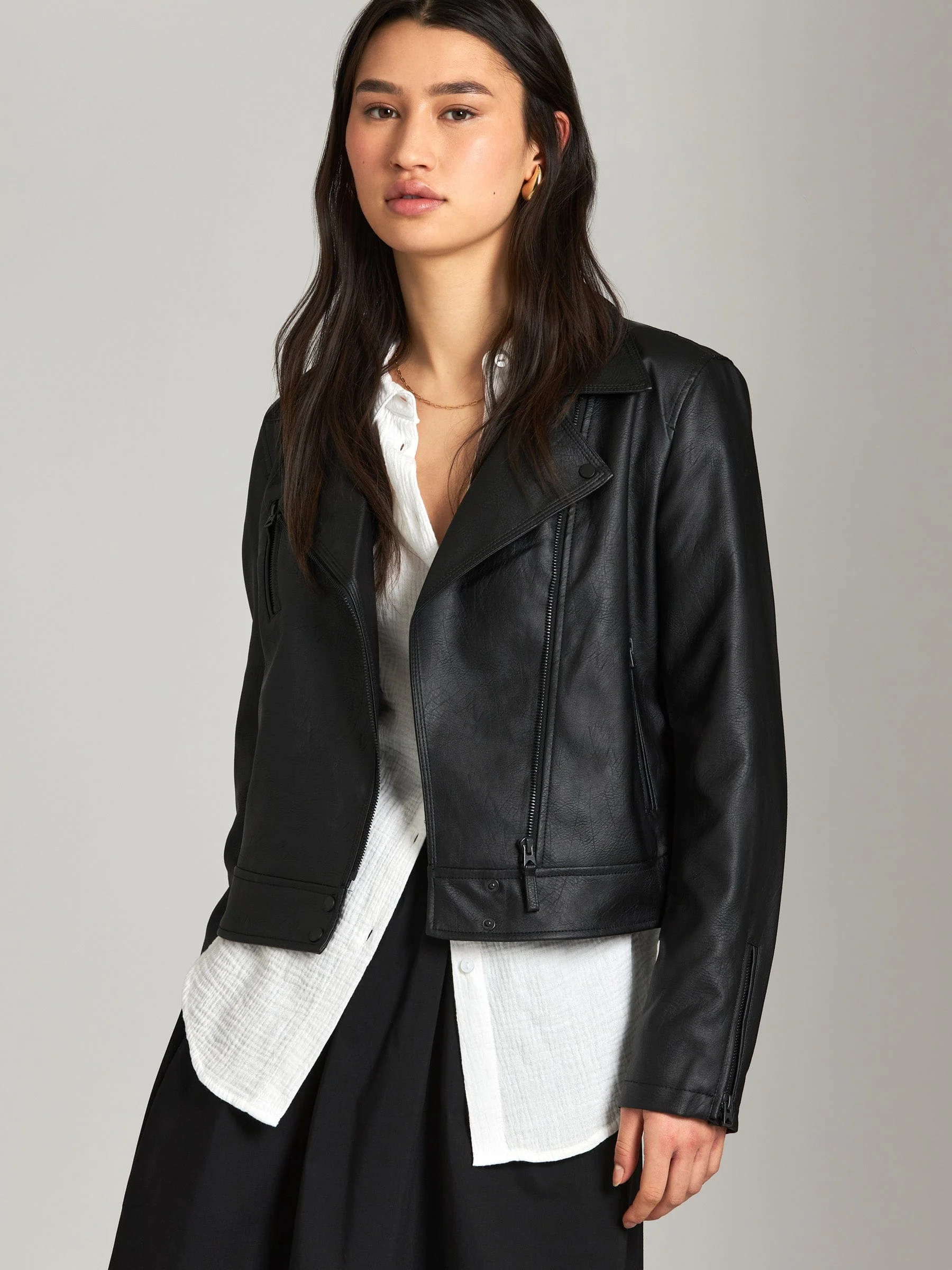 - Moto-style faux leather jacket
